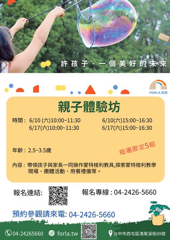 親子體驗坊 - 蒙特梭利小教室,時間: 6/10(六)10:00~11:30、 6/10(六)15:00~16:30 6/17(六)10:00~11:30、 6/17(六)15:00~16:30 年齡:2.5 ~ 3.5歲 內容:帶領孩子與家長一探蒙特梭利教學現場,一起操作蒙特梭利教具與團體活動。 點此》參加親子體驗坊