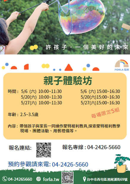 親子體驗坊 - 蒙特梭利小教室,時間: 5/6(六)10:00~11:30、 5/6(六)15:00~16:30 5/20(六)10:00~11:30、 5/20(六)15:00~16:30 5/27(六)10:00~11:30、 5/27(六)15:00~16:30 年齡:2.5 ~ 3.5歲 內容:帶領孩子與家長一探蒙特梭利教學現場,一起操作蒙特梭利教具與團體活動。 點此》參加親子體驗坊